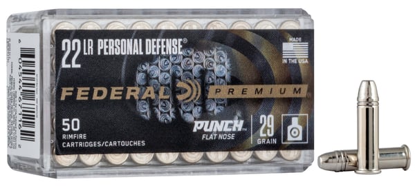 Self-defense isn't one size fits all. Punch™ 22 LR from Federal Premium® uses a first-of-its-kind nickel-plated lead-core bullet pushed at maximum velocities to achieve the deepest penetration through short-barrel handguns. So, whether you want to carry a 22 LR pistol as a backup gun, don't feel comfortable with centerfire pistols, or simply want to get more versatility from your rimfire, Punch makes the 22 LR cartridge a viable choice for the first time ever.