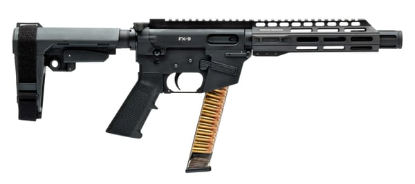 The FX-9 pistol (Freedom Xtreme) has a familiar set of operating controls for the avid AR-15 user, it accepts AR-15 stocks and buffer tube assemblies, as well as most free-float AR-15 rail assemblies. The FX-9 is machined from billet material, anodized type III aluminum components, and full hard nitride steel components including the barrel, bolt, ejector, last round hold open, feed ramp, and extractor for extended wear properties and corrosion resistance. The upper and lower receiver are more than 1" shorter than a standard AR-15, making it more compact and lighter. The FX-9 uses standard, double-stack Glock-style 9mm magazines.