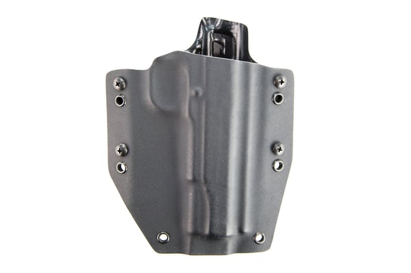 The MOD Holster is an outside the waist belt holster. Bottom of holster will have a channel for debris pass through. Comes standard with a straight draw. Cant is adjustable by moving beltloop position, up, down, upside down.