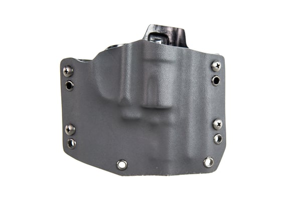 The MOD Holster is an outside the waist belt holster. Bottom of holster will have a channel for debris pass through. Comes standard with a straight draw. Cant is adjustable by moving beltloop position, up, down, upside down.
