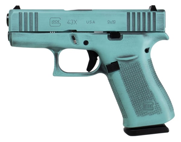 GLOCK offers over 50 pistols in a variety of sizes, calibers and styles. Each GLOCK pistol was designed and engineered to respond to a customers' needs. No matter which pistol you choose, it will deliver on GLOCK's promise of safety, reliability, and simple operation, all at an affordable price. Shark Coast has applied a Robins Egg Blue Cerakote finish which adds a touch of personality to the firearm, while the battleworn finish provides a rugged and worn look. The Tiffany Blue custom G43X is the perfect choice for those who want a firearm that combines style and function in a bold and unique way.