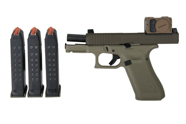 The Glock G45 MOS pairs a full-size G17-length slide with a compact G19 frame for best-in-class balance, recoil management, and concealability. This MOS package ships configured for micro-red-dot optics and in this configuration is fitted with an enclosed Aimpoint ACRO for instant target acquisition. The finished “Debo” Green gives the pistol a distinctive, modern look while retaining Glock’s proven reliability and ergonomic Gen-5 upgrades.