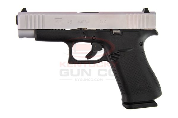 The G48 in caliber 9mm Luger is of similar length and height as the G19 but the width of the pistol is reduced for increased concealability and high carrying comfort. The magazine capacity of the slim 01 magazine of the G48 is 10 rounds. It comes with a silver colored nPVD coated slide with front serrations.