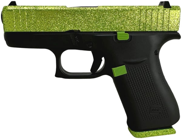 The standout feature of the Glock 43X "Zombie Green Glitter" is its vibrant and sparkly Zombie Green Glitter slide, which is sure to draw attention. The slide is serrated, providing an enhanced grip for slide manipulation. Despite its flashy appearance, the pistol maintains a black frame finish and black textured grips, ensuring that the pistol is as practical and comfortable to handle as it is fun to look at.