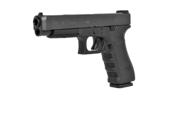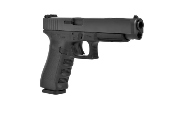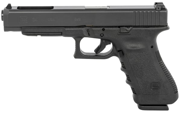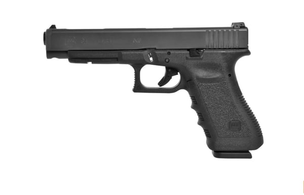 The Glock 34 Competition has a extended barrel, longer slide dimensions and elongated distance between sights. It features Glock's Safe Action system which provides a consistent trigger pull from the first to the last round. The three automatic independently operating mechanical safeties are built into the fire control system of the pistol. All three safeties disengage sequentially as the trigger is pulled and automatically reengage when the trigger is released. The frame is made of polymer with hardened steel guides. It features an ideal grip angle and low weight. The slide stop lever and the magazine catch are easily operated with the shooting hand. The advanced surface treatment of the slide results in optimal hardness by considerably reducing wear and tear and it makes it corrosion resistant, even when operating in saltwater conditions. The matte surface minimizes light reflection. The barrel is mechanically locked and cold-hammer forged. It also has the same advanced surface treatment as the slide. Its extractor serves as a loaded chamber indicator to comply with the laws of certain states and its position may visually and physically indicate whether there is a cartridge in the chamber of the pistol.