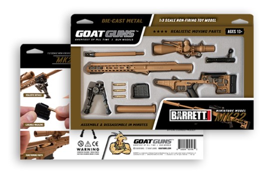Goat Guns Officially Licensed Barrett Mk22 Goatgun Model. 1:4 Scale Die Cast Metal Model. Build By Clicking And Screwing Parts In Place. Each Collectible Model Comes With 3 Dummy Rounds. Bolt Action With Shell Ejecting Function. Fully Functioning Bipod In.
