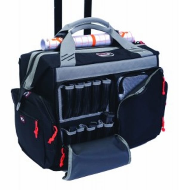 GPS Outdoors newest range bag features a first in Range Bag technology, oversized ATV wheels, a wide mouth top opening and a telescoping handle for easy transport. Why not have all of your heavy ammo, pistols and shooting gear in a wheeled range bag? They have incorporated the Visual ID Storage System into this new bag. All components of their storage system including storage pockets for Eye and Ear protection, Targets, Stapler, Tape, Binos, Tools, Cleaning supplies, Extra Magazines, and an innovative fold out Vertical Handgun Holder. This new handgun holder allows the shooter to store two medium or small frame handguns inside the bag in a secure vertical storage format that allows better organization at the range. This new Rolling Range bag was constructed with the same strong materials used in making better grade luggage. A rigid internal frame with 6 metal rivets ensure it’s long term durability. Bigger is Better!