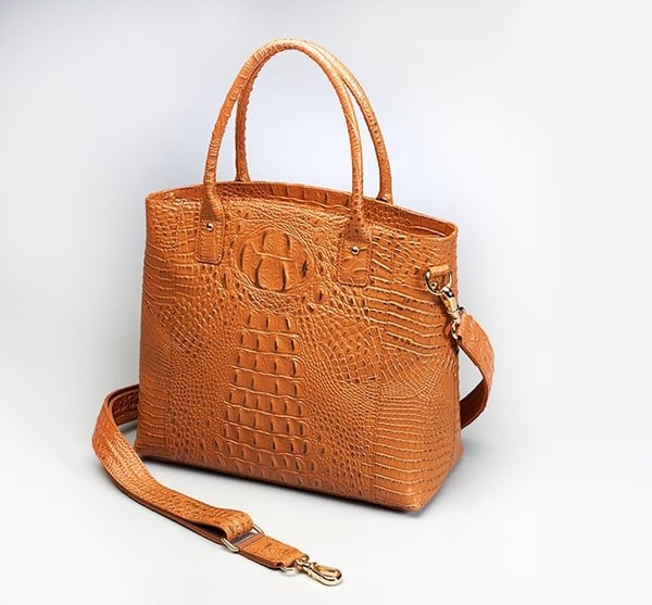 Elevate your concealed carry with the Gun Tote'n Mamas GTM-53/TN Town Tote, a stylish tan purse crafted from 3D Croco debossed American cowhide with gold hardware. Designed for left or right-handed use, it features a slash-resistant shoulder strap with 11-ply steel wire reinforcement, adjustable for crossbody comfort, and two top carry handles. The concealed carry compartment (8" L x 6" H) includes a Mernickle-designed standard holster, tested with Glock 27 (.40 cal) and Ruger LCP (9mm), with special padding to prevent gun imprinting. Nylon coil zippers ensure safety, while the fully lined interior with GTM logo fabric offers an extra zippered pocket and storage for smartphones, lipstick, and pepper spray. This durable tote softens with use, ages to a darker patina, and is praised for style and functionality