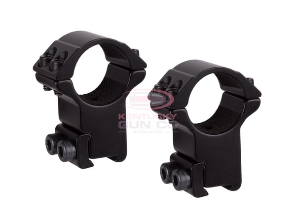 1" rings 2 piece High profile Fits 9 to 11mm dovetails 4 double hex screws hold scope firmly in place Retractable recoil scope stop pin Reversible dovetail clamp fits 9-11mm and 3/8 inch Internal cushion tape prevents marking and damage High-grade aluminum 3.6 oz. For illustration purposes only, this image may not be an exact representation of the product.