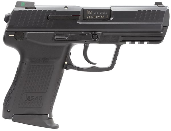 The HK45C (Compact) is well-suited for personal defense. It is smaller in length/height, uses a slim-line grip profile, and is nearly identical in features to the full-size HK45. It utilizes a cold-hammer forged HK proprietary O-ring barrel for precise barrel-to-slide lockup and optimal accuracy. The unique internal mechanical recoil reduction system reduces the recoil forces imparted to the weapon and shooter by as much as 30%, improving shooter control during rapid firing. The HK45 Compact also features a frame mounted improved USP-style control lever, combination safety and decocking lever, integral Picatinny rail, and polygonal rifling for longer barrel life. It comes with an extra backstrap for a custom fit for each shooter's hand. This Variant 7 LEM model has a 3.9" barrel, black finish, LEM (Law Enforcement Modification) firing system, three (3) 8-round magazines, and night sights. Shop with KYGUNCO for the best selection, competitive pricing, and exceptional customer service. Experience the difference that comes with buying from a trusted outdoor retailer with over 20 years of experience in the industry.