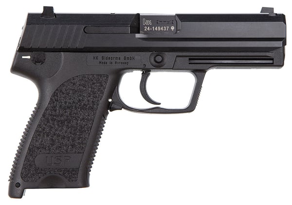 The HK USP (Universal Self-loading Pistol) is an accurate and ultra-reliable handgun. It utilizes a fiber-reinforced polymer frame stiffened by stainless steel inserts at areas subject to stress and friction. The control lever, a combination safety and decocking lever, is frame mounted and quickly accessible, unlike the slide-mounted safeties. The modular design of the USP's internal components allows the control lever function to be switched from the left to the right side of the pistol for left-handed shooters. The USP features a polygonal bore barrle, one-piece steel slide extended release, universal mounting grooves, and ambidextrous magazine release lever. This V1 model has a black frame with blued slide, 3-dot sights, and comes with two 15-round magazines.