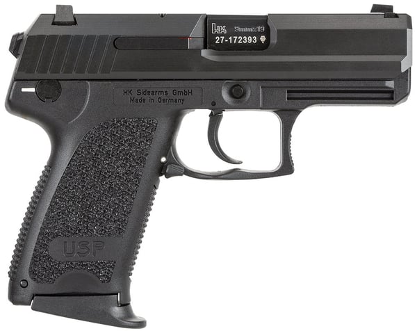 USP Compacts are smaller and lighter than large frame USPs. The reduction in trigger reach and grip circumference increases concealability and enhances shooting ergonomics. The USP Compact uses a narrow, full-hand grip frame with a choice of interchangeable extended or flush-fitting magazine floorplates. Like their large frame predecessors, USP Compacts are designed with the demanding needs of the law enforcement and military shooters in mind. Using a modified linkless Browning-type action, the USP Compact is built to take the punishment of high-energy +P loads. Variant 7 is a double action without control lever (no manual safety/decocking lever). It includes two magazines. Shop with KYGUNCO for the best selection, competitive pricing, and exceptional customer service. Experience the difference that comes with buying from a trusted outdoor retailer with over 20 years of experience in the industry.