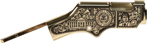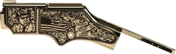 Own a unique piece of presidential memorabilia with our Limited Edition Donald Trump Henry Golden Boy Rifle. This fully functionable firearm is collector's beauty designed to honor the distinctive legacy of President Donald Trump. A custom painted American walnut buttstock of his fist in front of the American Flag is accompanied by an engraved forearm with his famous words "Fight, Fight, Fight!" In true Trump fashion, this deluxe model features a deluxe Brasslite engraved receiver with images of our 45th/47th U.S. President and on both sides. To further distinguish this edition, each rifle bears a unique serial number in the following format 4547TRUMP001, 4547TRUMP002, etc.