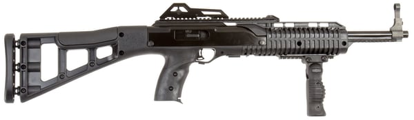 Hi-Point's 3895TS 380 ACP carbine has an all-weather, polymer skeletonized stock with an internal recoil buffer, multiple Weaver-style rails, a sling, swivels, and scope base. It has a quick on/off thumb safety, grip-mounted clip release, last round lock open feature, and fully adjustable sights (post front, peep rear). The 3895TS carbine has a 16.5" barrel for an OAL of 31". Hi-Point produces affordable, American-made firearms featuring 100% American parts and assembly. Hi-Point carbines are +P rated and accept all factory ammunition. This model features a forward folding grip. It has a black stock with black metal finish and includes a 10-round magazine. (The mag is not compatible with CF380)