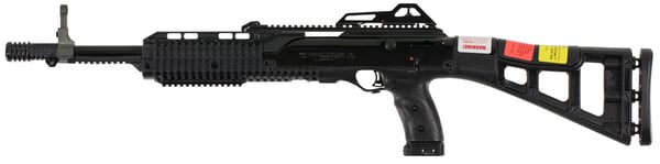 Hi-Point's 4595TS 45 ACP carbine has an all-weather, polymer skeletonized stock with an internal recoil buffer, multiple Weaver-style rails, a sling, swivels, and scope base. It has a quick on/off thumb safety, grip-mounted clip release, last round lock open feature, and fully adjustable sights (post front, peep rear). The 4595TS carbine has a 17.5" barrel for an OAL of 32". Hi-Point produces affordable, American-made firearms featuring 100% American parts and assembly. Hi-Point carbines are +P rated and accept all factory ammunition. This model features a laser sight. It has a black stock with black metal finish and includes a 9-round magazine.