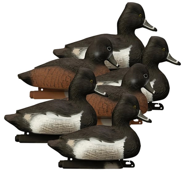 These Ringneck decoys feature deep, dark blacks, bright whites and rich, ruddy earth-tones. These decoys are lifelike, with deep feather carving and extra attention given to the eyes and to the bill details. This level of detail brings divers in from long distances, and finishes them up close. These decoys are extra wide, giving them more surface area for maximum visibility. Standard size decoys are slightly undersized from an average live duck, and are perfect for hunters looking for lightweight, packable, affordable decoys. Use them on their own, to pack in to your favorite public spot, or to add numbers and variety to any spread. Self-righting, weighted keel for quick and easy set-up in any water depth. Higdon's innovative keel clip allows simple short stringing in shallow water. Higdon's highly detailed, proprietary UV painting process and deep realistic carving techniques highlight each individual feather and minimize unnatural glare, even when decoys are wet. Our paint won't peel or fade, so your decoys will look great season after season.