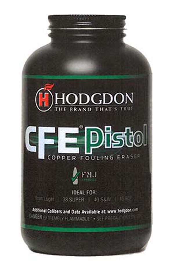 Hodgdon CFE Pistol is a spherical powder that was originally developed for US military application. This excellent pistol propellant utilizes the Hodgdon CFE formula, Copper Fouling Eraser, virtually eliminating copper fouling, plus providing top velocities with clean burning and minimal muzzle flash. For competitive shooters and hand loaders seeking the perfect powder for target or self-defense loads, CFE Pistol provides optimum performance in cartridges like the 9mm Luger, 38 Super, 40 S&W, the venerable 45 ACP and many more.