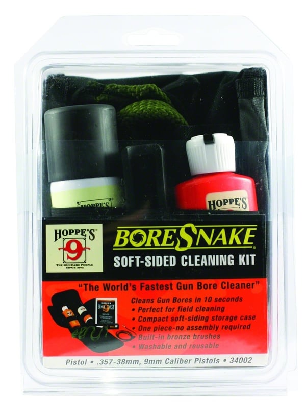 The BoreSnake soft-sided gun cleaning kit includes BoreSnake, Hoppe's No. 9 Gun Bore Cleaner, Hoppe's Lubricating Oil, Hoppe's Weatherguard Cloths, and a pulling tool. The BoreSnake cleaning kit comes in a rugged, soft-sided case that attaches easily to a belt and fits compactly into a box or bag for convenient use at the range.