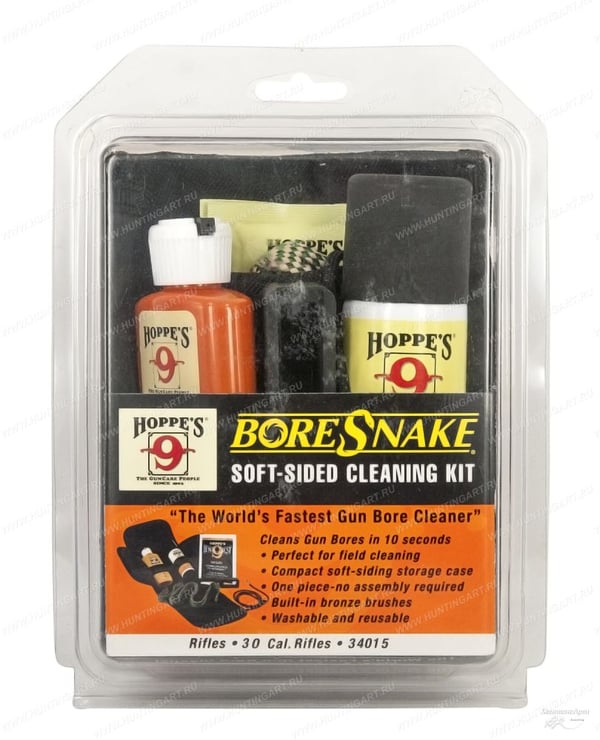 The BoreSnake soft-sided gun cleaning kit includes BoreSnake, Hoppe's No. 9 Gun Bore Cleaner, Hoppe's Lubricating Oil, Hoppe's Weatherguard Cloths, and a pulling tool. The BoreSnake cleaning kit comes in a rugged, soft-sided case that attaches easily to a belt and fits compactly into a box or bag for convenient use at the range.Take this complete, super compact BoreSnake Gun Cleaning Kit anywhere. The rugged, soft-sided case attaches easily to a belt and fits compactly into a box or bag.