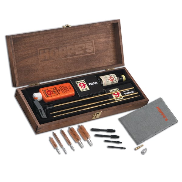 This kit contains Hoppe's No.9 solvent, lubricating oil, patches, three piece brass rod, four slotted ends and five phosphor bronze brushes to fit .22 and .30 caliber rifles, .38 caliber handguns, and 12 and 20 gauge shotguns. The kit also contains a rifle, shotgun adaptor, handgun adaptor, silicone cleaning cloth and Hoppe's Guide to Gun Care booklet.