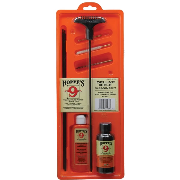 Hoppe's Rifle Cleaning Kit is clamshell packaged. It includes No. 9 solvent, No. 9 lubricating oil, and an aluminum rod with a knob, slotted ends, and brush to keep your gun clean and shooting properly all year round.