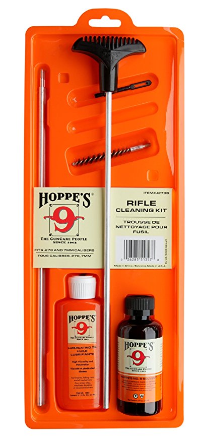 2 oz. Hoppe’s No. 9 Gun Bore Cleaner, 2.25 oz. Hoppe’s Lubricating Oil, Round die-cut patches for an absorbent surface with deep cleaning, Slotted ends and adapters, where appropriate and Aluminum cleaning rods, unless otherwise noted.