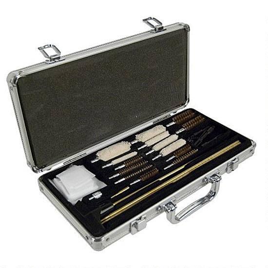 The Deluxe gun cleaning accessory kit includes: three-piece universal brass cleaning rod; Eight phosphor bronze brushes to fit .22, .270/7mm, .30, .357/9mm, .40/10mm and .44/.45 calibers, along with 12 ga. and 20 ga; Six swabs for 12 ga. and 20 ga., plus .35/.38, .22/.270, .280/.32, and .40/45 calibers; Four slotted ends to fit .410 bore to 20 ga., 16 and 12 ga., .30 caliber and .22 caliber; Four knob ends for .22, .30, .38 and .44/.45 calibers. Shotgun and pistol adaptable.