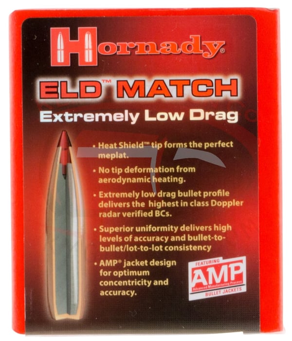 This is the Hornady developed Extremely Low Drag (ELD) Match Bullet. ELD Match bullets are technologically advanced, enhanced accuracy target bullets featuring Heat Shield tips with the perfect MEPLAT (tip point) combined with numerous design features that deliver the highest in class ballistic coefficients, superior accuracy and extreme consistency from bullet to bullet, lot to lot.
