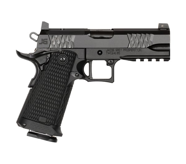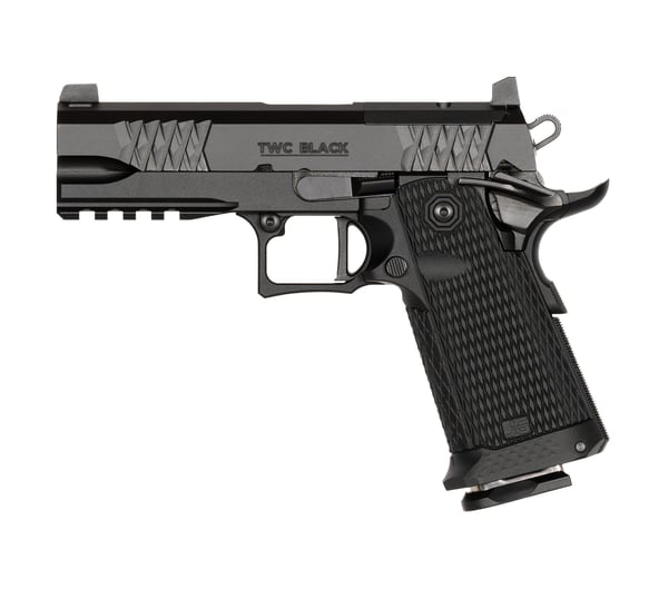 The TWC Black represents the next evolution in the TWC series, incorporating user feedback to enhance both ergonomics and performance. Featuring an aggressive grip texture that wraps around the entire grip, the TWC Black ensures confident handling even in challenging conditions. Maintenance is simplified with a tool-less guide rod, while black nitrided fasteners and a matching black nitrided bull barrel elevate the firearm’s sleek aesthetic. The upgraded, non-skeletonized trigger, hard coat anodized in black, completes the refined design, offering both visual appeal and superior functionality.