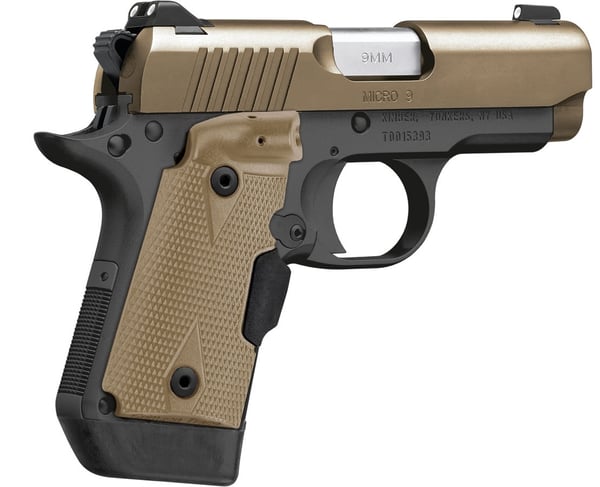 Complete with Desert Tan slide, matte black frame finish and desert tan Crimson Trace Lasergrips, the Micro 9 Desert Tan has a smooth trigger pull, mild recoil and the intuitive operation of a 1911. All Micro frames are shaped from the finest aluminum for integrity and strength. In many respects a miniature 1911, among the most important Micro 9 design advantages is a single action trigger with the kind of short, smooth pull that ensures accuracy and builds confidence. The thumb safety, slide release and magazine release are pure 1911 as well. Standard features include a lowered and flared ejection port for flawless ejection and a beveled magazine well for fast, positive loading. Sights are steel – not plastic – and mounted in machined dovetails for additional integrity. Each Micro 9 includes a flush-fitting 6-round magazine and an extended 7-round magazine is available as an accessory.