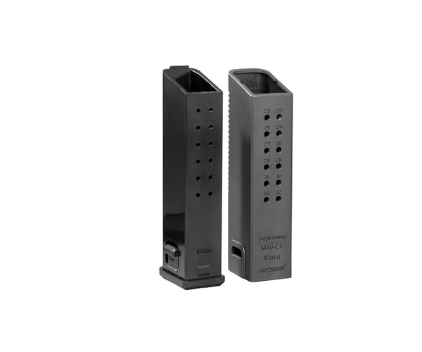 The KRISS Mag-Ex Kit 2 is the ultimate capacity extending base plate for your factory standard Glock magazines. The KRISS Mag-Ex Kit 2 is made up of the extended baseplate, outer sleeve, and extended spring, constructed of durable and lightweight reinforced composites. Combining the Mag-Ex Kit 2 with the factory standard Glock magazine body and follower is a perfect match of reliable feeding, toughness, and aesthetics for the KRISS Vector. This Mag-Ex Kit 2 is 45ACP and designed for standard capacity G21 magazines for an overall capacity of 30 rounds of .45ACP for your KRISS Vector, Glock handgun, and your Glock magazine-compatible pistol caliber carbine.