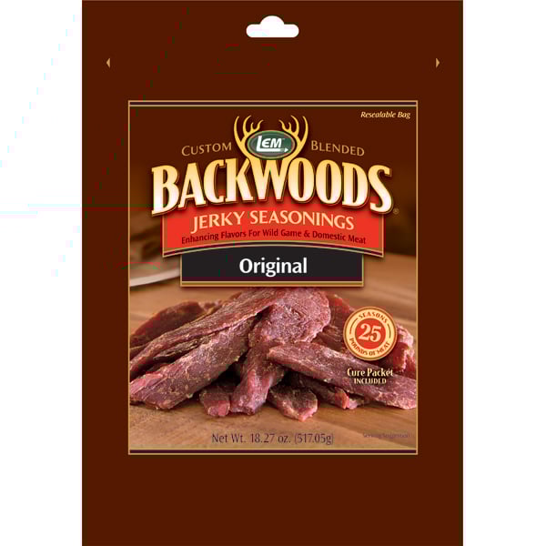 Uniquely blended for those who enjoy processing their own foods, LEM Products Backwoods Jerky Seasonings are just what you need to transform your favorite meats into a culinary delight. Crafted with a mouthwatering blend of premium spices, our versatile seasonings are perfect for marinating strips of meat or mixing with ground meat. From wild game to domestic meat, our unique blends add that extra deliciousness to any meat dish. Our Original Jerky Seasoning mix has been around since the days of the Western frontier. To use the marinade method, slice your chosen meat to your desired thickness, immerse it in water and seasoning mixture, and refrigerate for 8 hours. For the ground meat method, combine meat with a water mixture until tacky and form into strips. With both methods, cook in the oven at 200°F for 1 hour and 15 minutes on each side, or dehydrate according to your dehydrator's manufacturer's instructions. Then refrigerate or freeze your finished product. Backwoods Seasonings makes it easy and simple with our easy to follow instructions and pre-measured cure in every package. One 18.3 oz. packet seasons up to 25 pounds of meat. Contains MSG.