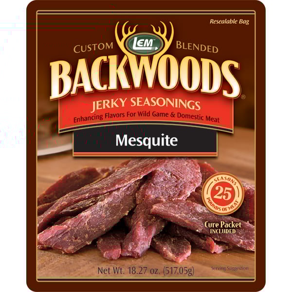 LEM Products Backwoods Mesquite Jerky Seasoning, Ideal for Wild Game and Domestic Meat, Seasons Up to 25 Pounds of Meat, 18.3 Ounce Packet with Pre-Measured Cure Packet.