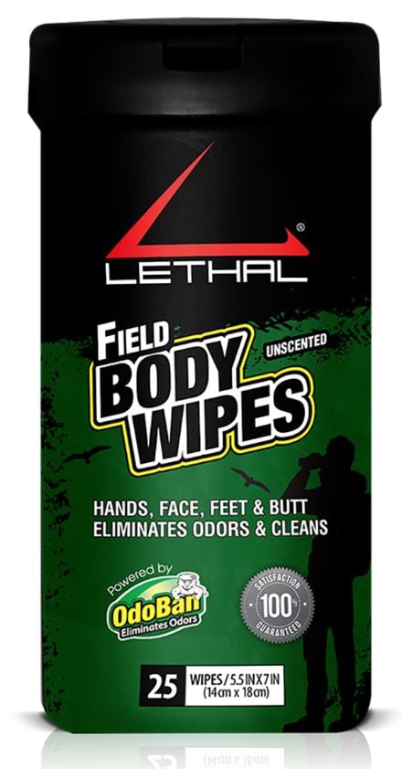 Lethal field body wipes eliminate odors and stickiness from perspiration as well as blood and urine after field dressing.Plus they eliminate everyday smells such as smoke, food, gas & diesel and even skunk.