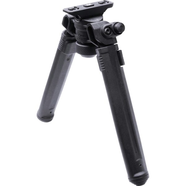 Deploying and adjusting the Magpul Bipod is quick and easy. Spring-tensioned legs stow neatly forward and snap down and lock into place with one hand. Leg extensions slide and lock securely with the push of a button on any of the seven half-inch spaced locking detents. The legs extend a full four inches, from 6.3” to 10.3”. An industry-exclusive 50° of total tilt and 40° of total pan are controlled by a glove-friendly knurled tool-less bipod locking knob located between the extended legs, allowing easy adjustment between shots. Additionally, the Magpul Bipod has the exclusive ability to lock pan at 0° while maintaining full tilt functionality.