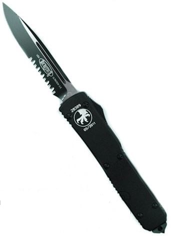The Ultratech, the flagship knife of Microtech, has set the standard for out-the-front knives. This is their original, dual action OTF knife and through the years has undergon several modifications. Each time, it has become more efficient and reliable. This model, the 121-2T features a black (with stainless highlights) part serrated blade and all black tactical hardware. The handle is black anodized 6061 aluminum. The Ultratch's spring remains "at rest" at all times except when deployed. This means the compressed spring does not become fatigued and assures you that the knife will fire with consistency and power. Get one today for your collection--or to carry.