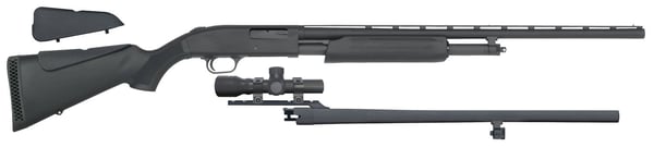 This Mossberg 500 Field/Deer Combo features a black synthetic dual comb stock with a blued metal finish. This 20 gauge combo comes with two barrels: a 24" fully rifled barrel and a 26" vent rib barrel with bead sights. It is equipped with a 3" chamber, includes an Accu-Set of choke tubes, and comes with a Dead Ringer 2.5x20mm scope.