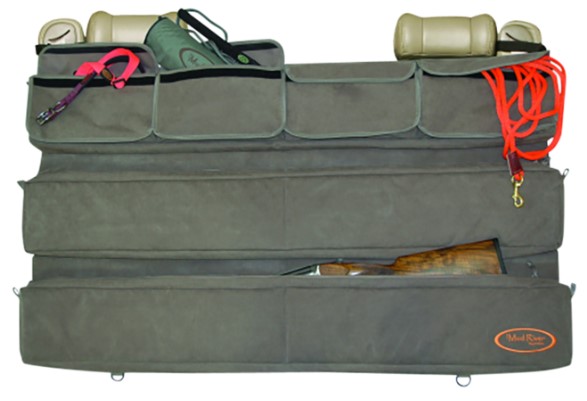 The mud river truck seat organizer keeps all your hunting and training accessories at your fingertips.Stay organized with the four 12" x 6.5" x 2" hook and loop closure pockets along the top paired with the two 49" x 6.5" x 2" lower padded gun cases (not lockable).Best of all the bottom case of the mud river truck organizer is detachable and accommodates up to a 48" shotgun so it can double as a field gun case.You can carry it all with this versatile organizer that quickly attaches from the back seat of your truck or suv.The mud river truck seat organizer gives you all you need to stay organized and keep your truck clean.
