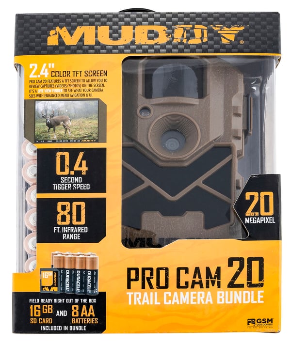 The Pro-Cam 20 Combo features 20 megapixel; LCD backlit screen; simple to program; memory- requires secure digital card, up to 32gb: field of view- 3 zone + 50 degree detection angle and three image resolutions- 20 MP/8 MP/4 MP. Camera is cable lock and padlock ready and mounts with an adjustable strap. Operates on 6 AA batteries or 12V DC alternate power option. Battery life is up to 10,000 images. ncludes 8 AA batteries, nylon mounting strap and a 16GB SD card.