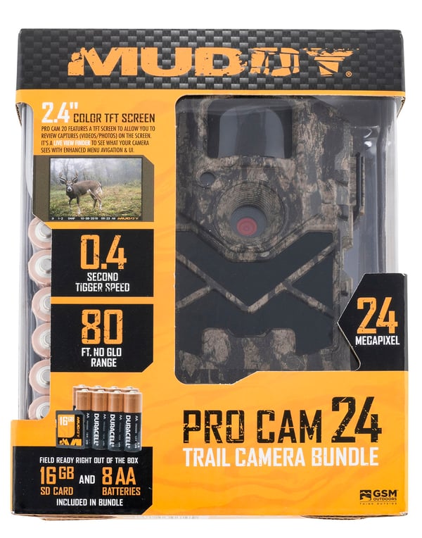 The Pro-Cam 24 Combo features 24 megapixel; LCD backlit screen; simple to program; memory- requires secure digital card, up to 32gb: field of view- 3 zone + 50 degree detection angle and three image resolutions- 24 MP/8 MP/4 MP. Camera is cable lock and padlock ready and mounts with an adjustable strap. Operates on 6 AA batteries or 12V DC alternate power option. Battery life is up to 10,000 images. ncludes 8 AA batteries, nylon mounting strap and a 16GB SD card.