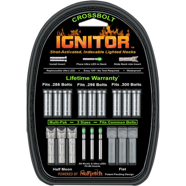 Each multi-pack provides precision inserts for .285, .295 and .300 diameter bolts. No adapters needed, select and install the Swiss turned insert for your bolt, place the LED battery light into the half-moon or flat nocks provided. Nock centering is automatic for unmatched accuracy. LED battery light replacement takes seconds.