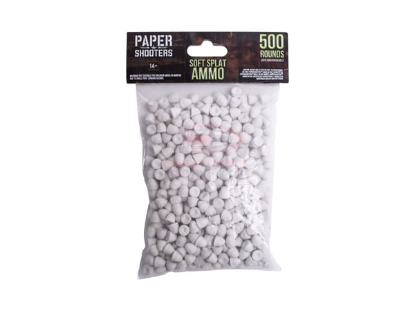 Paper Shooters Ammo Bag 500ctThis 500 count bag of ammo for your PaperShooter blaster ensures you'll be ready for a day of fun! Before battle commences, the 'soft- splat' ammo is soaked in water to ensure a satisfying splat, then carefully placed into each shell. The shells are then loaded into the magazine. Lock it up and you're ready to go! The 'soft-splat' ammo will stick to the target so you always know what you've hit! Cleaner than spitballs... more accurate than watermelon seeds... and exploding with fun that leaves you with a smile every time!