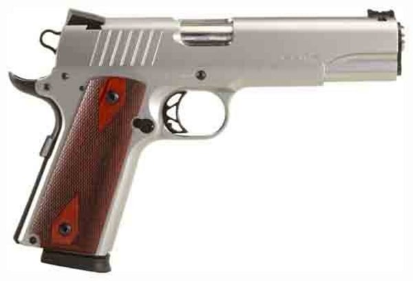 •Stainless steel frame & slide •Stainless match grade barrel •Checkered mainspring housing (25 LPI) •Full-length guide rod •2-dot dovetail rear sight •Green fiber optic front sight •Beavertail grip safety •Adjustable skeletonized trigger •Cocobolo Double Diamond grips •(2) 8-rnd. mags