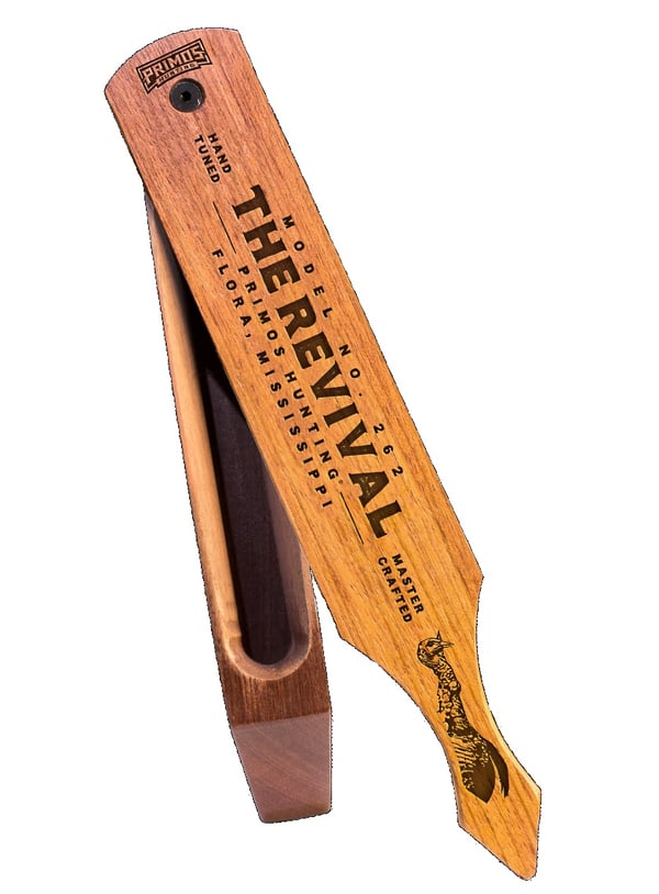 The Primos Revival™ is a long box that can be run loud or soft for prospecting or finishing a bird that last little bit. Loud high pitch long yelps and cuts for prospecting and locating birds is easy with the long paddle and trough. Also, use to finish off a bird with soft yelps or purrs.