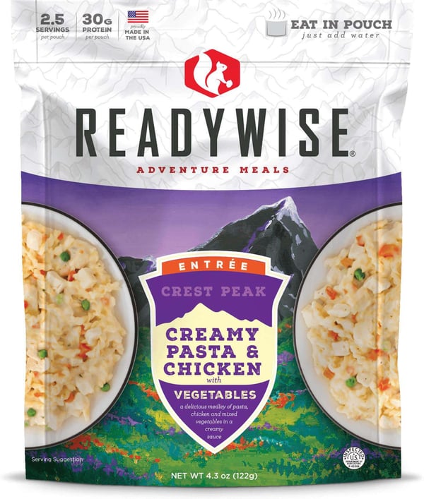 - Each pouch of ReadyWiseCrest Peak Creamy Pasta & Chickencontains 2.5 servings and is resealable. These pouches are lightweight making them easily portable on any outdoor adventure. Just add water and you can eat directly from the pouch.