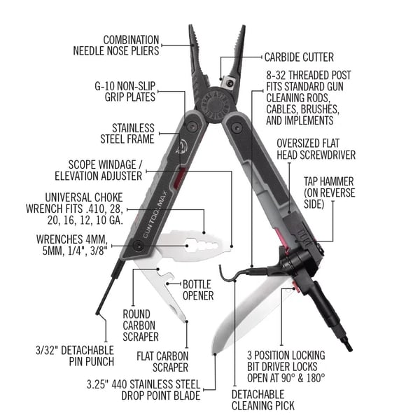 Packed with precision-made, gun-specific tools for hunters and shooters, this highly versatile multi-tool repairs, customizes, and makes disassembly and reassembly fast and easy. Included are needle-nose pliers with carbide cutter, a universal choke wrench, 3-position locking bit driver, and a heavy-duty 440 stainless steel knife. The ballistic nylon sheath carries 12 additional bits for added functionality. It's a whole new breed of Gun Tool.