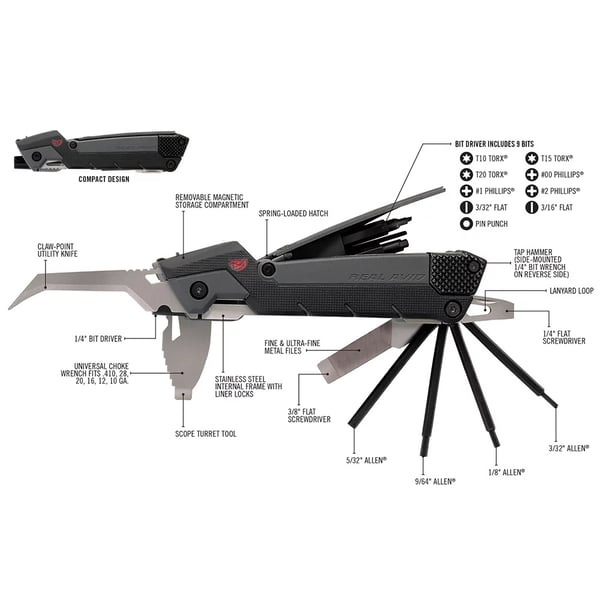 Made for Rifles and Shotguns, the Gun Tool Pro's Rock-solid frame features 30 hard-working tools. Two-inch long bits fit into the magnetic 1/4" driver and 1/4" wrench for extra torque. It features two files, a locking claw-point knife, and a removable magnetic storage container for holding small screws and pins. It also features a universal choke wrench and tap hammer, all in a sleek tactical design. Gun Tool Pro sets the standard for compact gun tools.