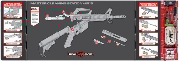 Upgrade your cleaning experience with the worlds first AR15 Master Cleaning Station. It combines a Next-Gen cleaning mat with an intelligently designed cleaning kit filled with an extensive set of AR15 cleaning tools. The kit provides how-to cleaning and maintenance instruction and keeps easy-to-lose gun parts organized while you work. It also provides a huge work area for a completely disassembled gun, yet rolls up for compact storage in the included bag.