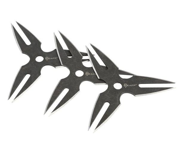 Hit the bullseye every time with these perfectly balanced throwing stars. The Reapr 3 Piece Chuk Star set is ideal for camping, parties, barbecues and other outdoor activities. The 4.25” (108 mm) stonewashed finished blades withstand the elements and are built for throwing accuracy. The Chuk Stars are constructed from 420 stainless steel and fit securely into the 1680D ballistic sheath with MOLLE attachment. Aim for the Stars!
