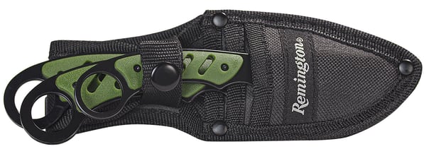 Featuring 440 Stainless Steel and stonewashed blades, the Sportsman Series of Remington Cutlery offers a broad range of products to fit the everyday sportsmans lifestyle. Durable polymer coarse textured handles are available in tan and black or OD green and black. This series of specialty knives and tools for outdoorsmen and women includes saws, gut hooks, skinning, game processing, and multi-purpose. Choose from fixed blades or folding. 7.25" Gut Hook, 7.25" Skinner, 6.5 Caping Knife. Olive Drab Skeletonized handles with finger loop.